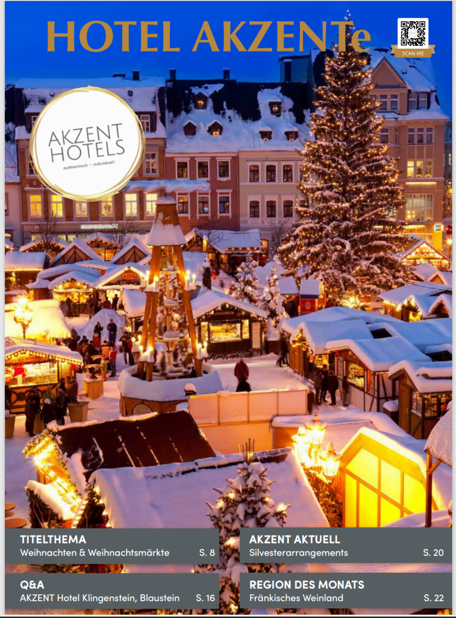 wenn die Tage kürzer werden und der Duft von Zimt, Nelken und gebrannten Mandeln durch die Straßen zieht, beginnt sie wieder – die wohl stimmungsvollste Zeit des Jahres. Weihnachten steht vor der Tür, und mit ihr die Zeit für Gemütlichkeit, Genuss und gemeinsame Erlebnisse. In dieser Winterausgabe von HOTEL AKZENTe laden wir Sie ein, in die festliche Welt unserer AKZENT Hotels einzutauchen. Lassen Sie sich inspirieren von den schönsten Weihnachtsmärkten Deutschlands, entdecken Sie kulinarische Ideen rund um winterliche Rezepte und freuen Sie sich auf erholsame Silvester-Arrangements für einen gelungenen Start ins neue Jahr.